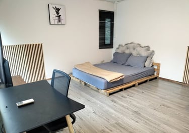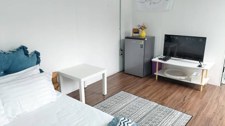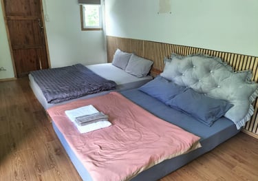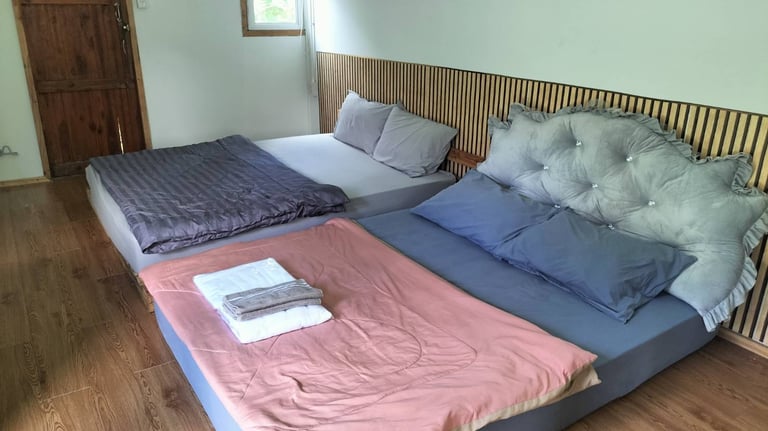 Rooms for 2-3 people with mountain views, a peaceful atmosphere, and cool weather all year round. There is a TV, air conditioning, bedding, and a water heater.