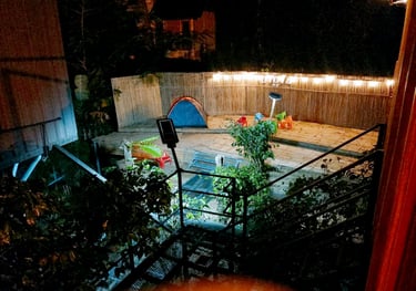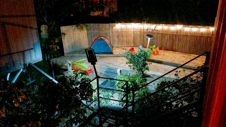 Rooms for 4-5 people with mountain views, ideal for families or groups of friends. Features a front balcony and an outdoor activity area. There is a TV, air conditioning, bedding, and a water heater.