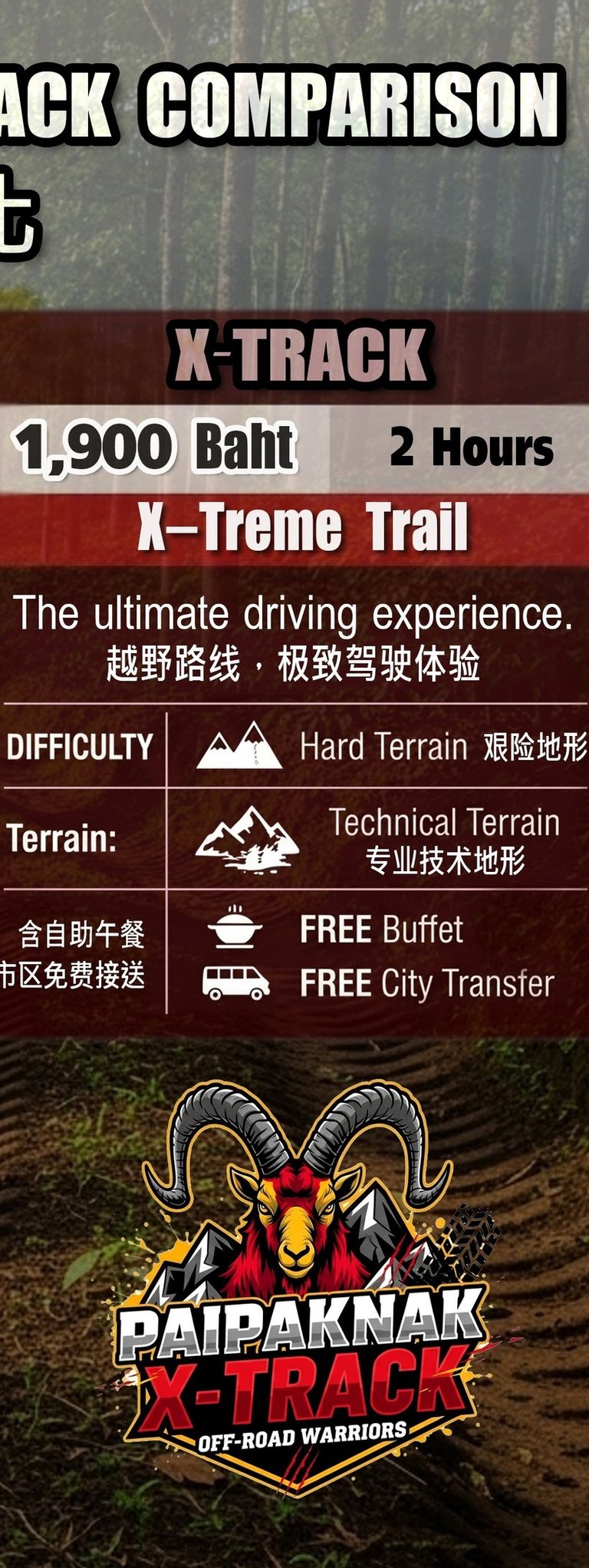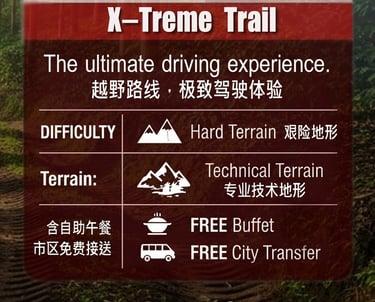 释放你内心的冒险精神,体验专为寻求刺激者设计的 X-Track!征服这条 95% 的丛林小径,体验陡峭的攀爬、崎岖的地形和泥泞飞溅的刺激。准备好迎接一场肾上腺素飙升、挑战极限的野外探险之旅吧!